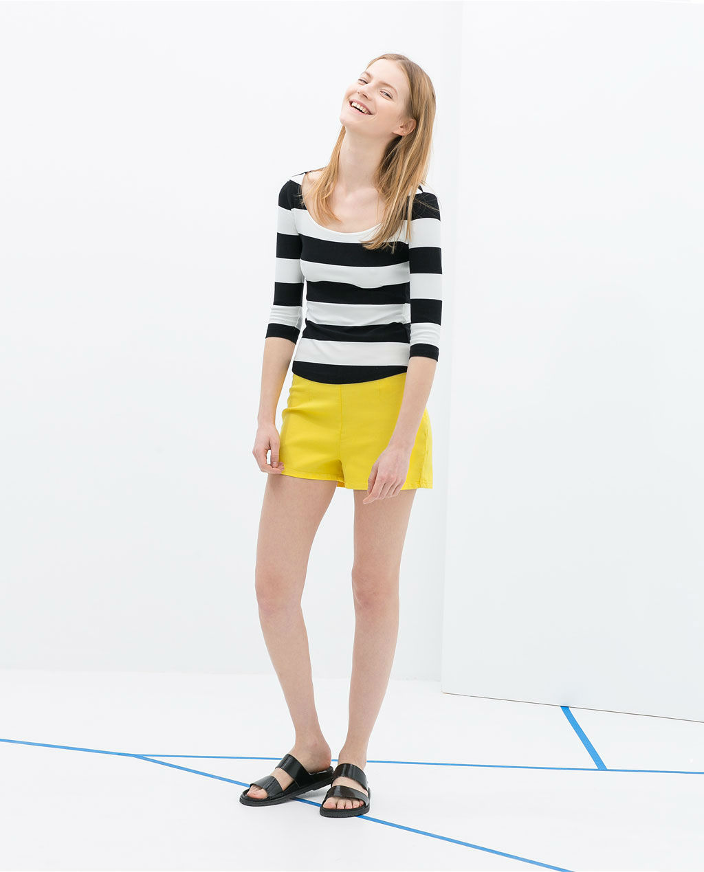 Unos shorts de tiro alto en color amarillo darán alegría a tu outfit. Póntelo con sandalias planas o de tacón.¿Con cuál te gusta más?