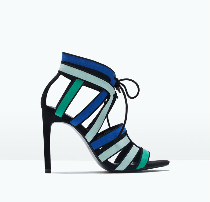 Sandalia de tacón envolvente tricolor con tiras en azul, verde y negro, cierre mediante cordones en el empeine. Altura del tacón: 10 cm (25’99 euros)
