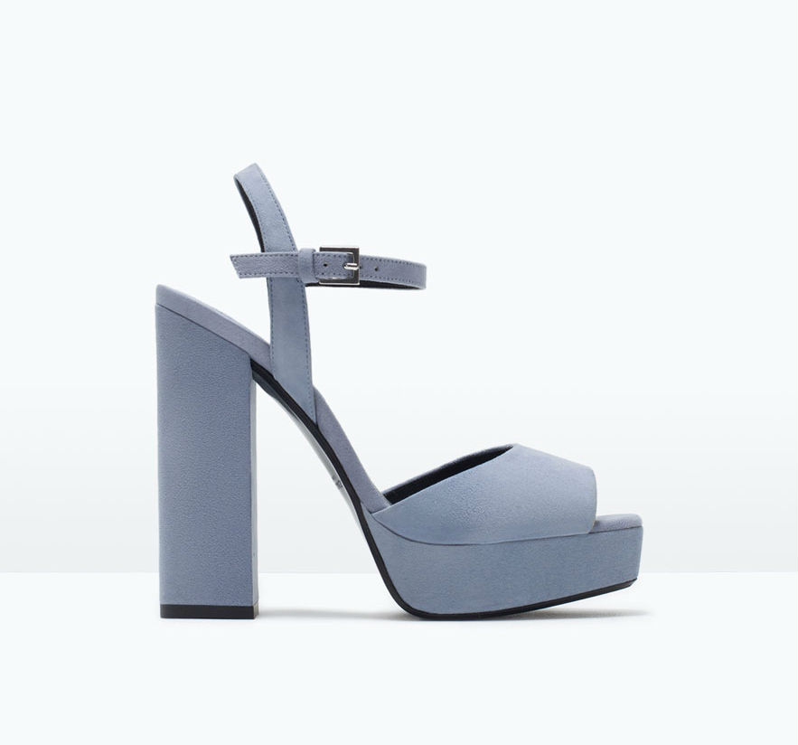 Sandalia de tacón con plataforma en color azul y acabado en ante. Altura del tacón: 11’5 cm (29’99 euros)