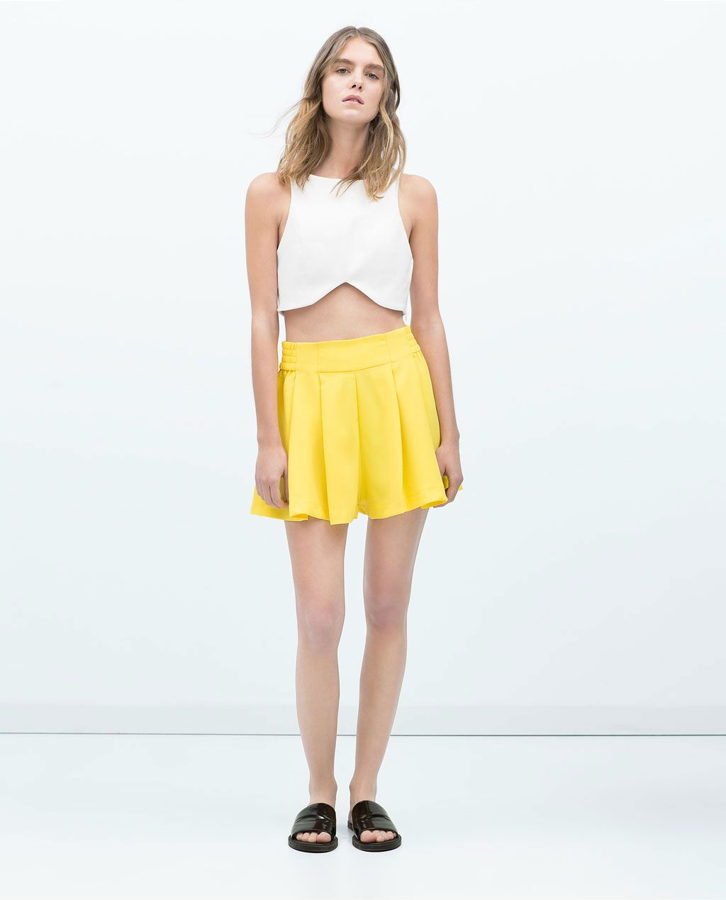 Parece una falda pero no lo es, gracias a las pinzas y al vuelo esta prenda juega al despiste y su tono llamativo favorece el bronceado del verano. Un crop top blanco y unas sandalias de tacón serán suficientes para completar un outfit de 10.