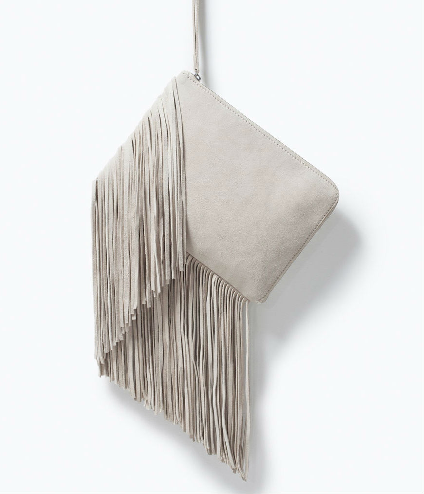 TOP 2. Bolso sobre de piel acabado en ante con detalle flecos en la parte inferior y lateral.