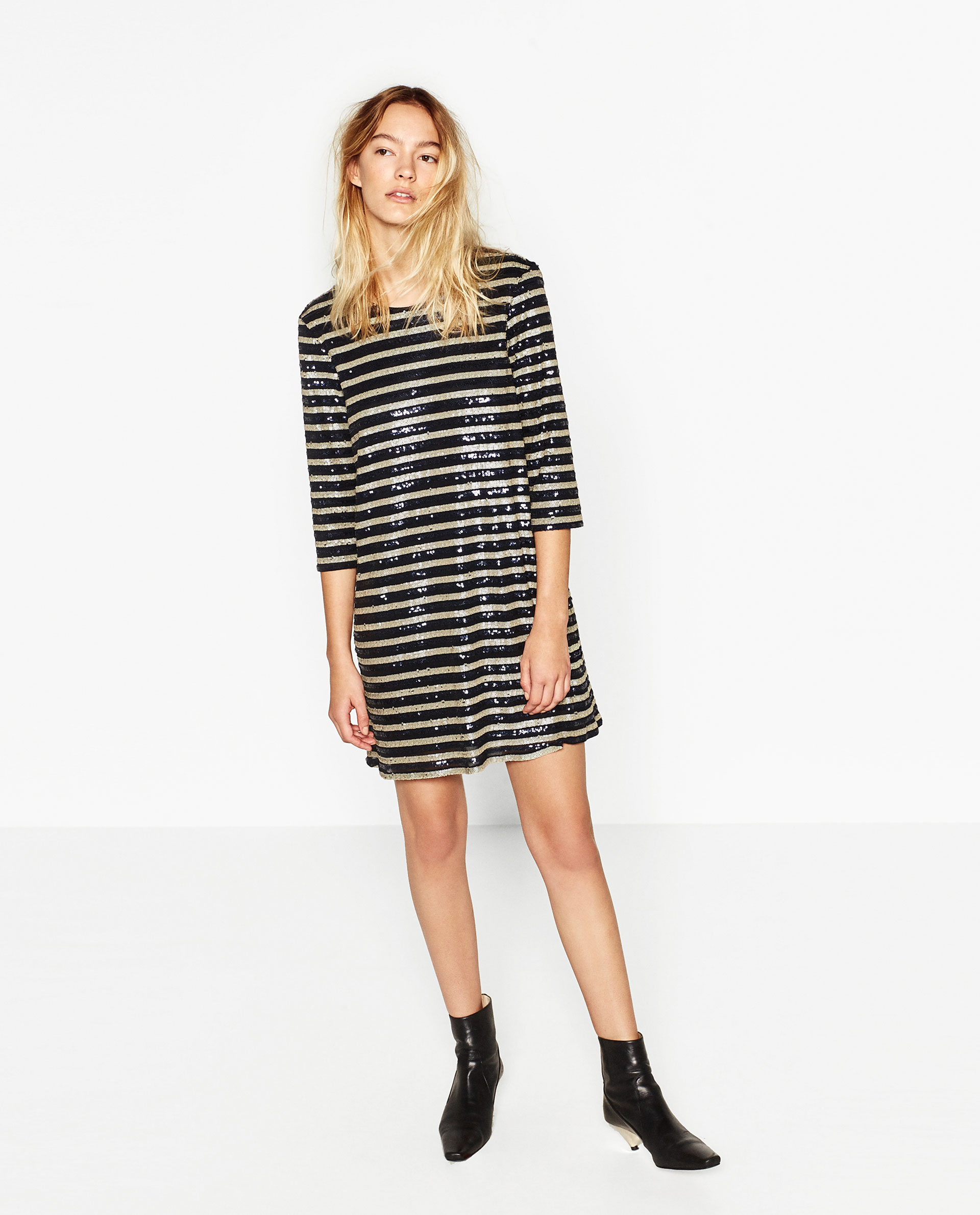 Brilla con luz propia gracias a las lentejuelas que conforman en vestido de Zara. Puede ser una opción de 10 para Nochevieja o un fin de semana elegante con tus amigas. Rayas en color dorado y negro son los aliados de un modelo cargado de glamour.