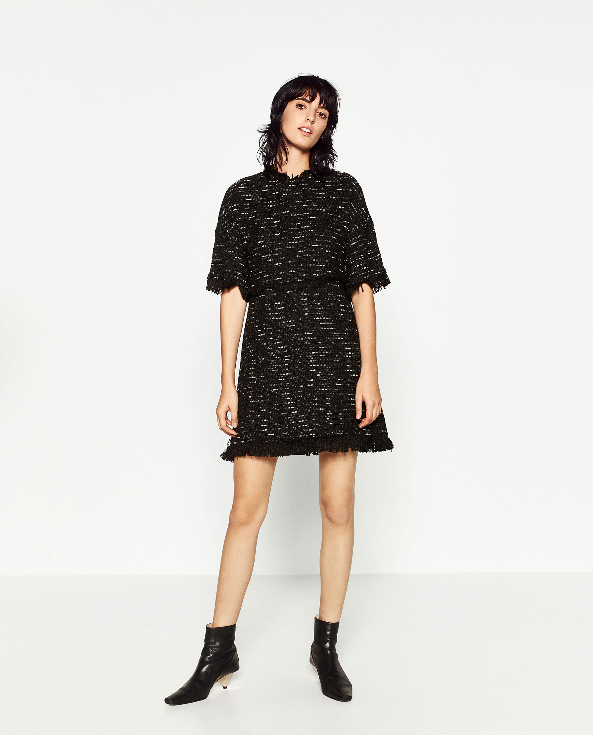 Zara vuelve a inspirarse en las incombustibles colecciones de Chanel escogiendo el tejido de tweed como básico. En definitiva, otro Little Black Dress que se adapta a las últimas tendencias de la temporada.