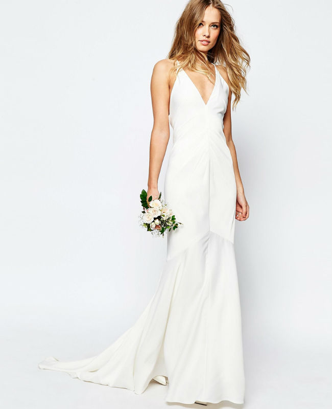 Asos lanza looks de boda como este vestido largo escotado y encolado de tirantes para aquellas novias que no se atreven con vestidos llamativos pero quieren mostrar su figura con delicadeza. Gracias a escotes pronunciados como los de este look, su espalda abierta con estilo camisola unida con tirantes y su cola extralarga con forma de pez, dejará a todos boquiabiertos.