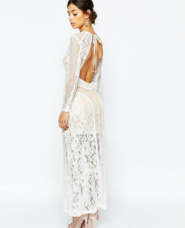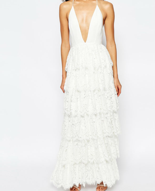 Uno de los looks exclusivos en Asos es el vestido largo a capas Bridal de Fame and Partners , llamativo por su pronunciado escote hasta el ombligo, su tejido a diferencia de los anteriores es texturizado y su falda de encaje escalonada da vuelo y movimiento a este vestido más desaliñado y atrevido, sin abandonar el largo y los lazos cruzados en la espalda.