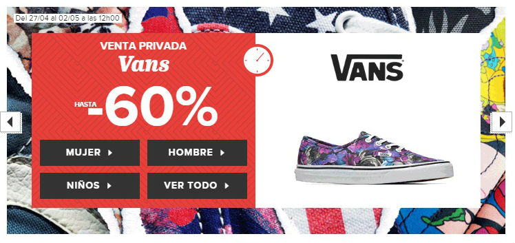 Esta primavera verano 2016 la tienda online nos sorprende con dos promociones que estamos seguros te van a encantar. La primera es su venta privada de la colección de Vans, marca líder en deportivas skater. Del 27 de abril al 2 de mayo a las 12.00 horas podrás disfrutar de hasta un 60% de descuento en diferentes modelos.