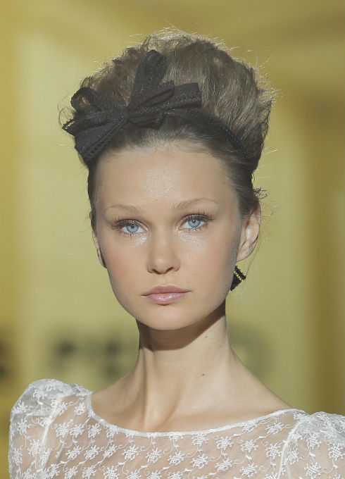 Jesús Peiró propuso para la novia romántica del 2014 los moños altos cardados con accesorios estilo vintage como telas y abalorios o lazos negros que aportan sofisticación y un estilo informal.