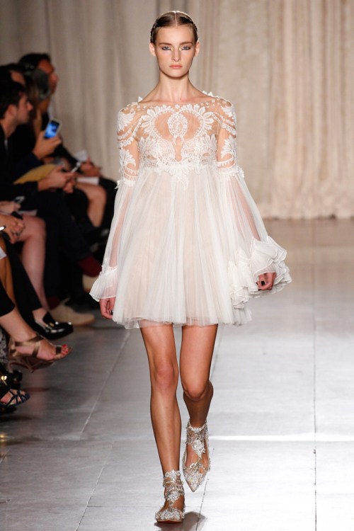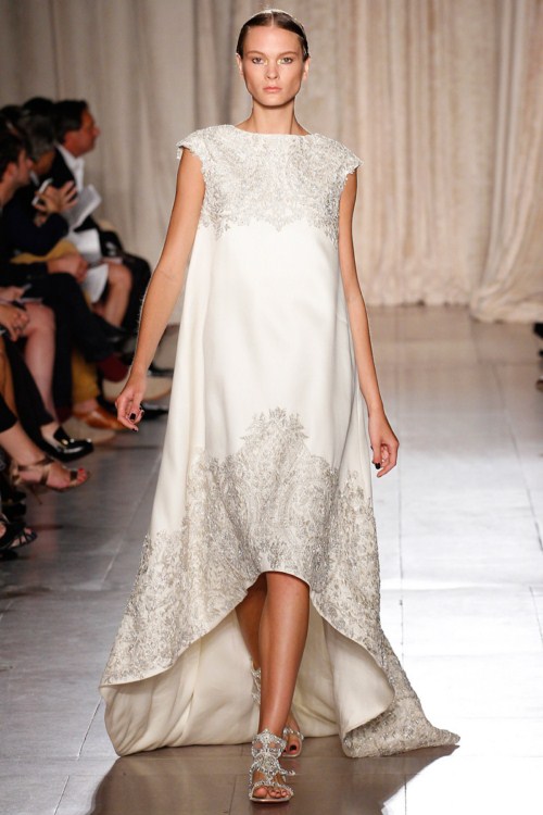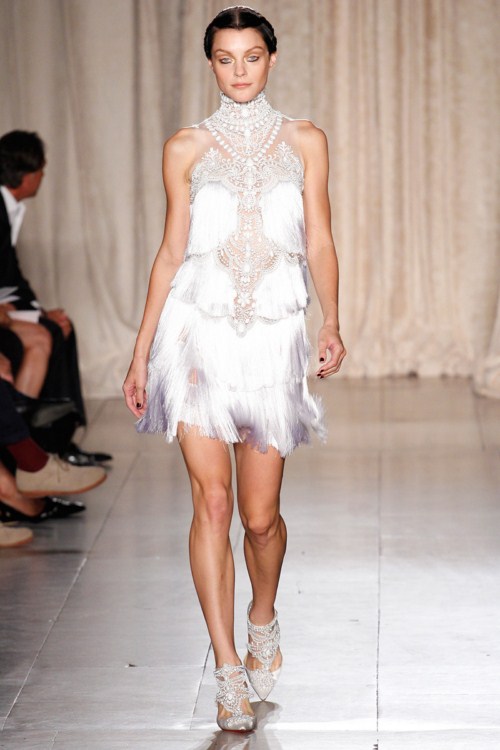 En el desfile de la colección de Primavera-Verano 2013 de Marchesa vemos vestidos con aires exóticos e indios recordándonos a sus orígenes. Un ambiente que nos transporta a la India de los años 60, enfundadas en sedas y oros, y calzada por mravillosas sandalias con pedrería hechas por Christian Louboutin.