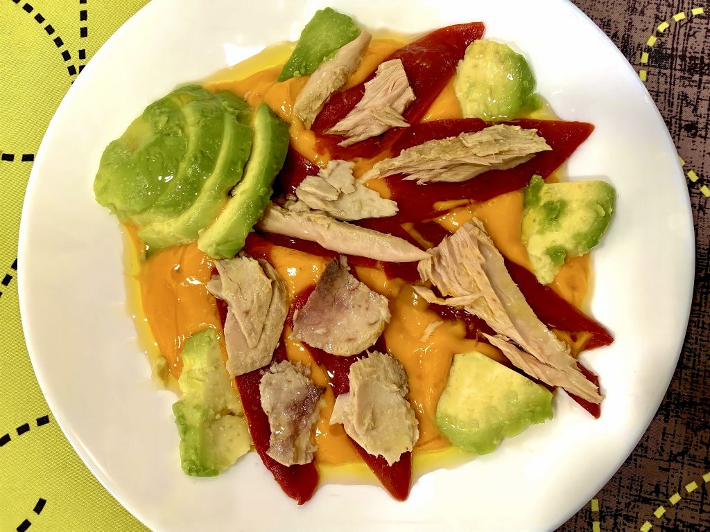Cuando nuestro salmorejo esté lo suficientemente frío, lo extendemos sobre un plato llano; colocamos los pimientos en tiras sobre este, las láminas de ventresca junto al aguacate laminado, un poco de AOVE por encima… et voilà! ya tienes un platazo con un sabor increíble en menos de 15 minutos.