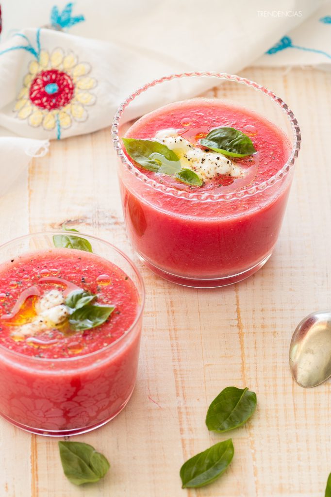 Si te gusta el gazpacho como una sopa fría, lo mejor es servirlo tal cual del vaso batidor a un cuenco o un plato hondo y decorarlo con trocitos de sandía, albahaca y un chorrito de aceite de oliva.