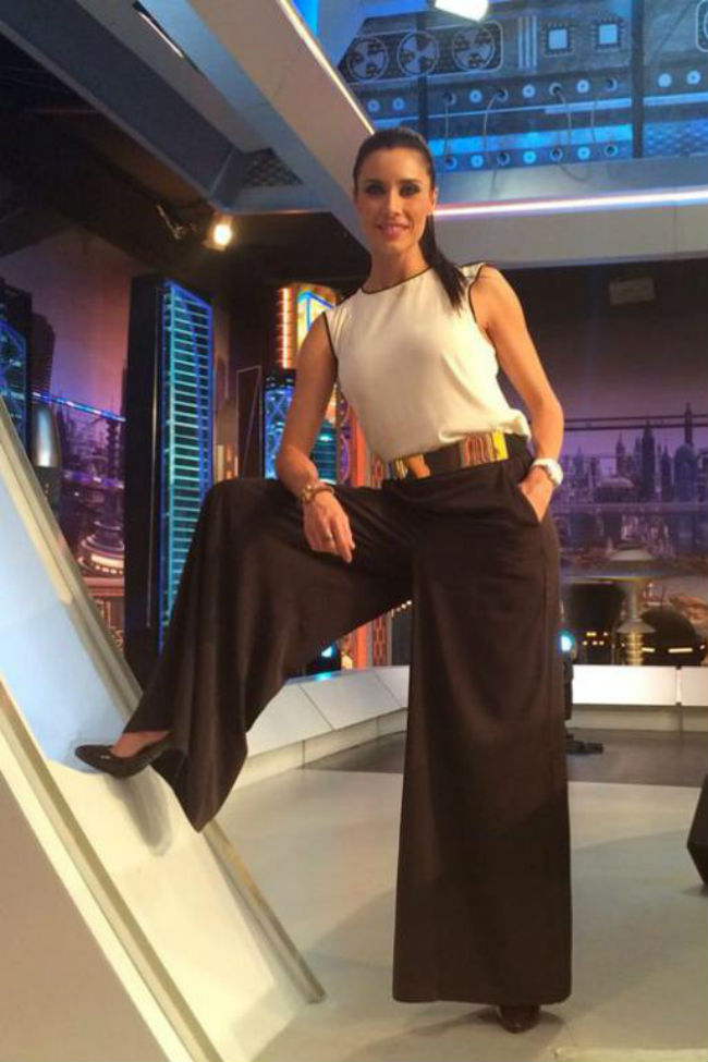 Blusa y pantalón de stradivarius, zapatos de Mariamare, cinturón de H&M y pulsera de Elena Estaun, el look low cost de Pilar Rubio para la rueda de prensa de El Hormiguero.