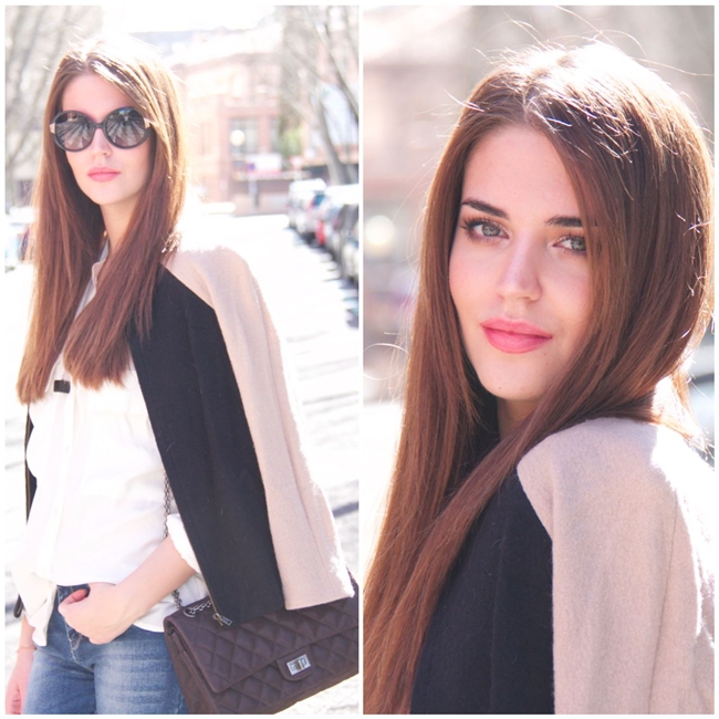 Clara viste con una camisa blanca de seda de Zara y una chaqueta de entretiempo en beige y negra de Aritzia. Este tipo de chaquetas son perfectas para los días en los que todavía refresca.
