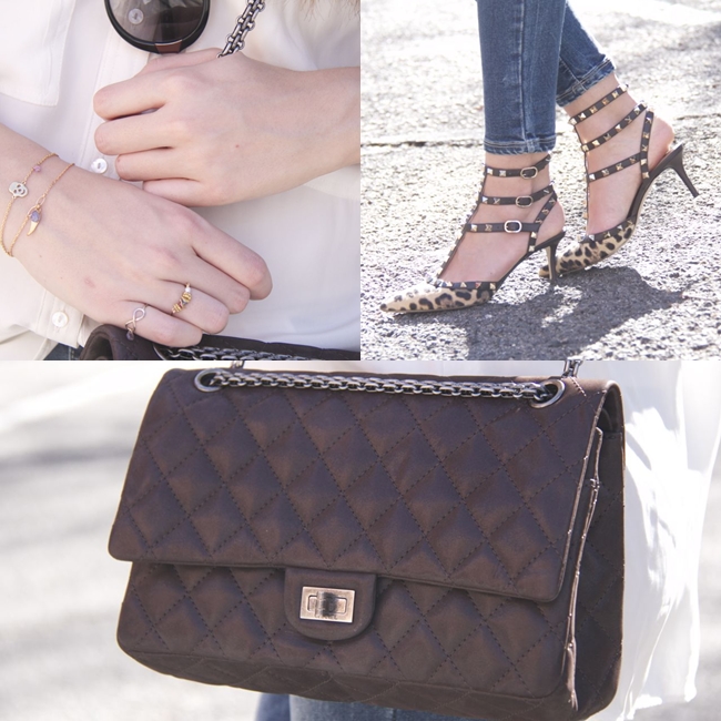 Clara Alonso completa el look con un discreto bolso negro de efecto acolchado de Chanel y los famosísimos zapatos con print de leopardo y tachuelas de Valentino. Las joyas que luce son unas finas pulseras y anillos de Gemmasu Jewels.